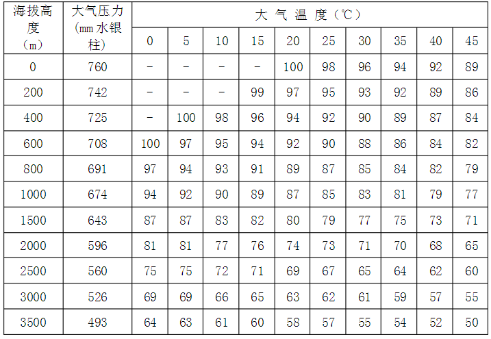 2、如果外界氣壓、氣溫、濕度等上述標準情況下,則應按下列附表中所列的修正系數加以修正,即實際功率應等于標準乘以修正系數c。下列兩表分別為50%及100%相對濕度下各種氣、氣溫情況的修正系數c如溫度為其他數值時,可利用插入法根據此二表計算出相應的修正系數。