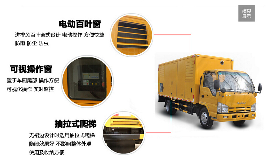 移動電源車由二類汽車底盤,靜音廂體,柴油發動機,發電機組,控制系統,內外照明裝置,輸配電裝置,電纜卷盤,電源輸入,輸出接口,液壓支腿等構成。